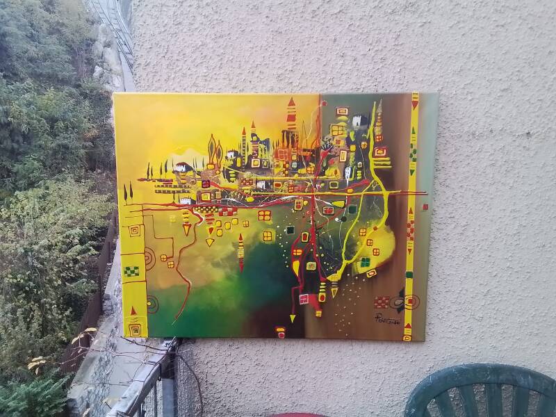 Öl leinen. 80 x 100. Abstrakte Stadt.