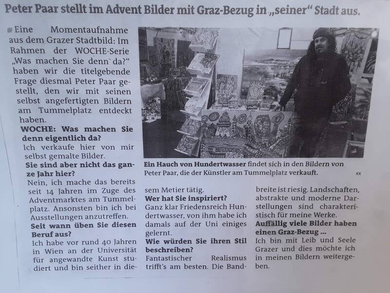 Willkommen bei Peter Paar ich bin ein freischaffender Künstler aus Graz der sich auf einzigartige Kunstwerke spezialisiert hat. Mein Ziel ist es, Kunstwerke zu schaffen, die Emotionen wecken und inspirieren. Jedes meiner Kunstwerke ist ein Unikat, das von Künstler Peter Paar handgefertigt wird. Entdecken Sie die Schönheit der Handwerkskunst und lassen Sie sich von meinen Kunstwerken verzaubern. Studium an der Angewandten in Wien und danach tätig im eigenen Atelier in Graz. Vertreten in internationalen Ausstellungen und Vernissagen im In und Ausland.